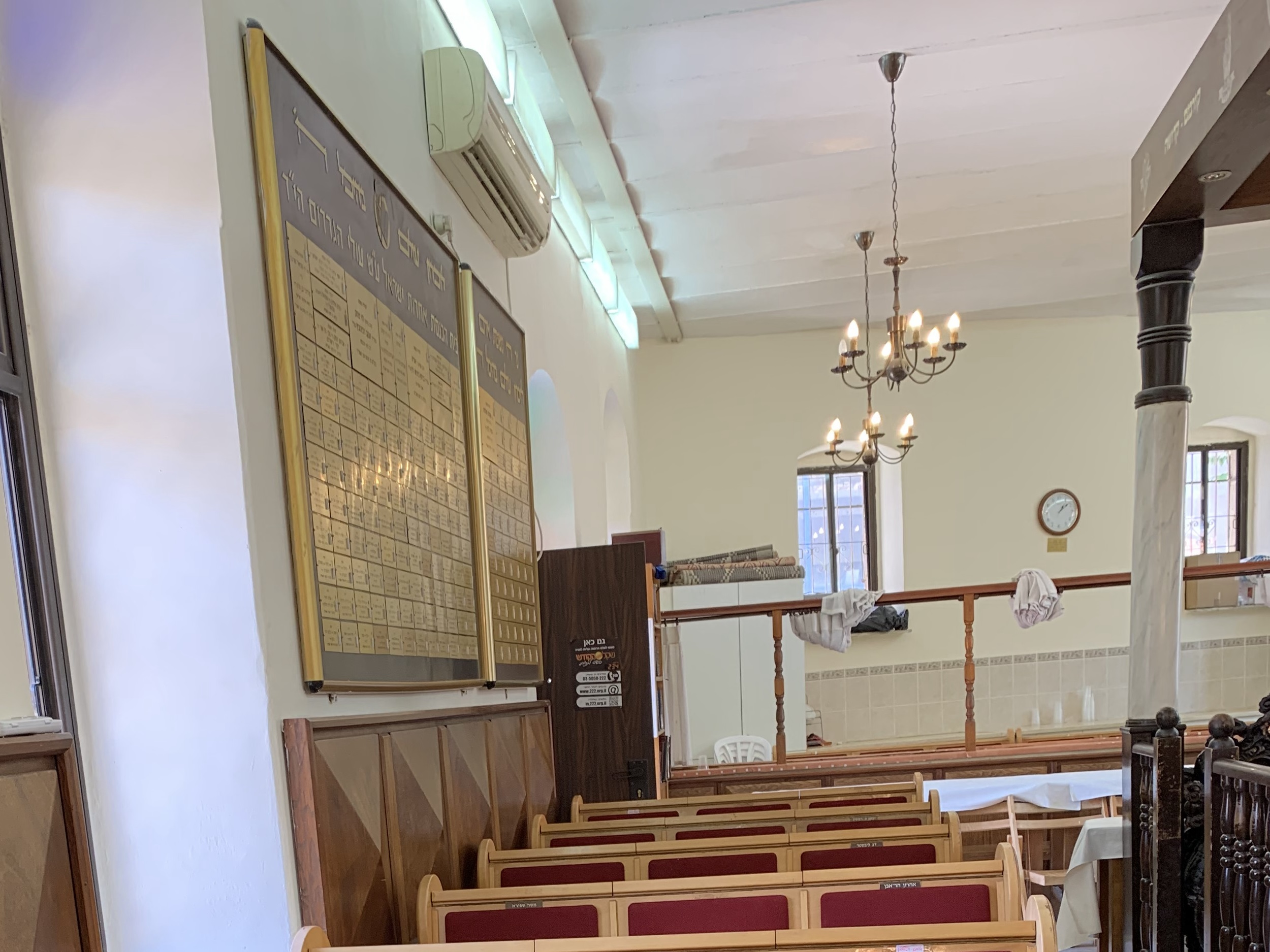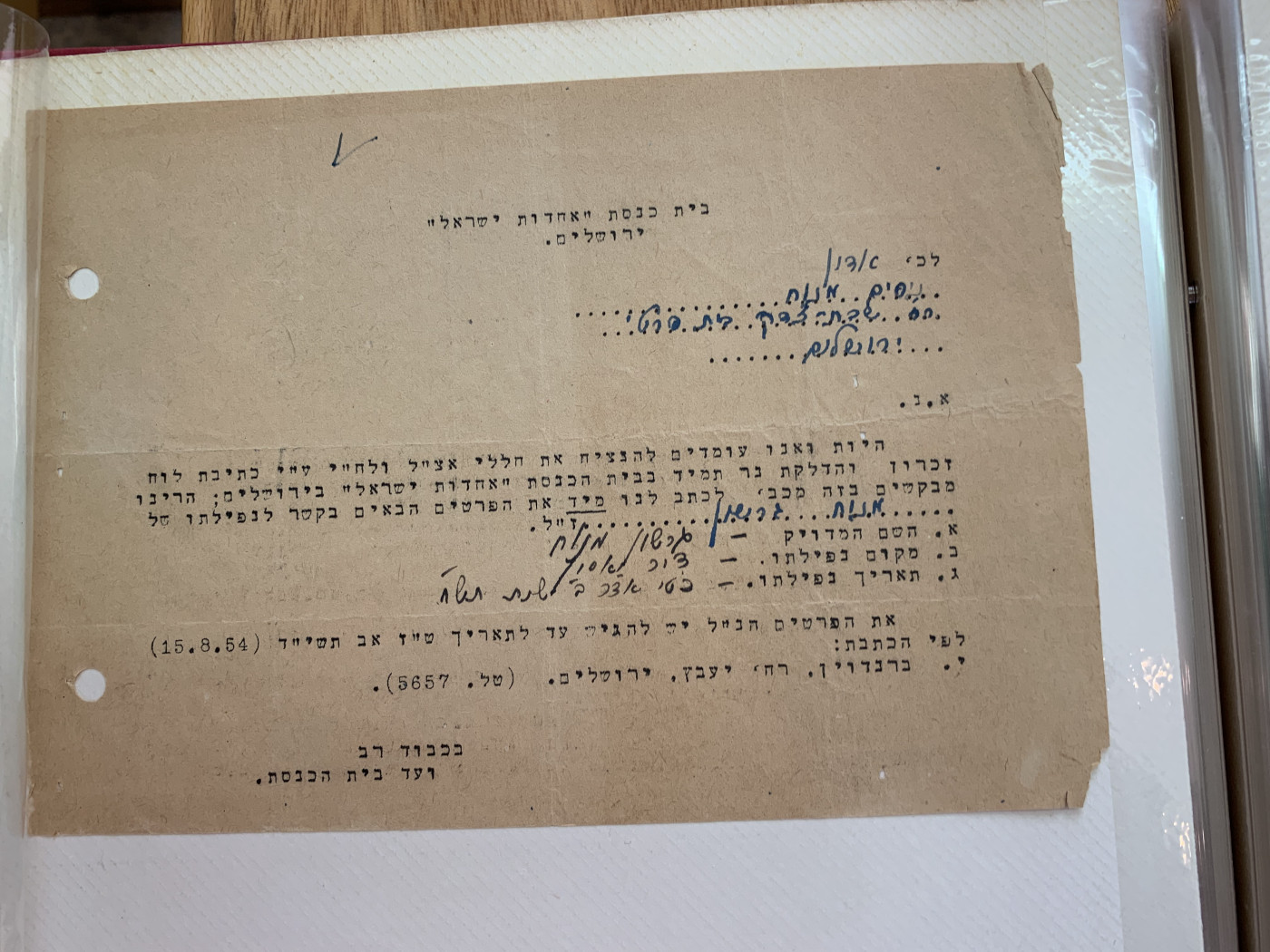 The synagogue committee worked very hard in the early 1950s to preserve the memory of all the underground fallen soldiers on the main Yizkor Board. Avichai showed us this picture of a letter sent in 1954 to the family of a fallen underground soldier, Gershon Manoach, asking for biographical details to be preserved on the Yizkor Board.