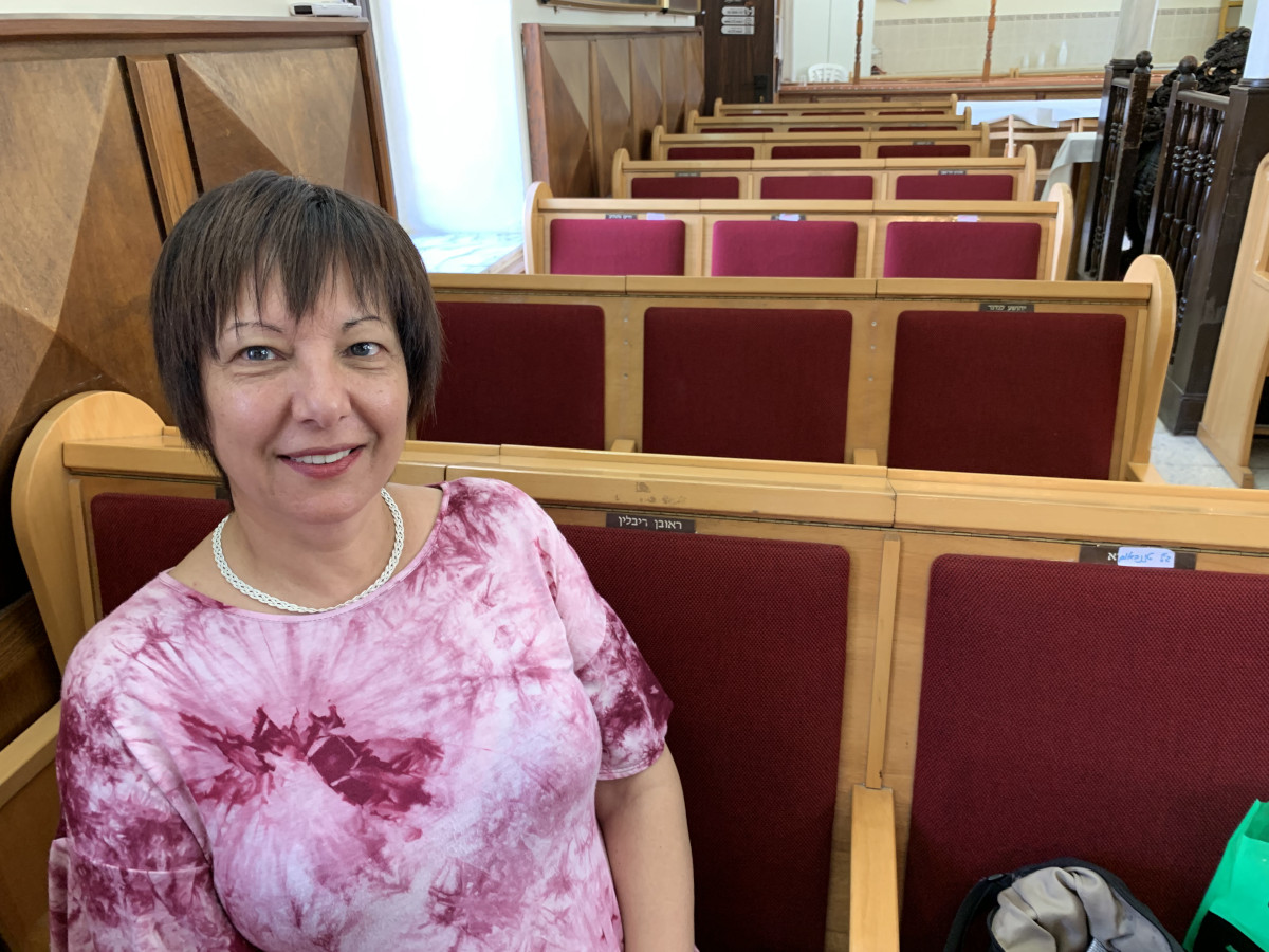 My wife, Orna, sits on one of the prayer benches along the northern side of the synagogue. These benches are just under the main Yizkor Board.