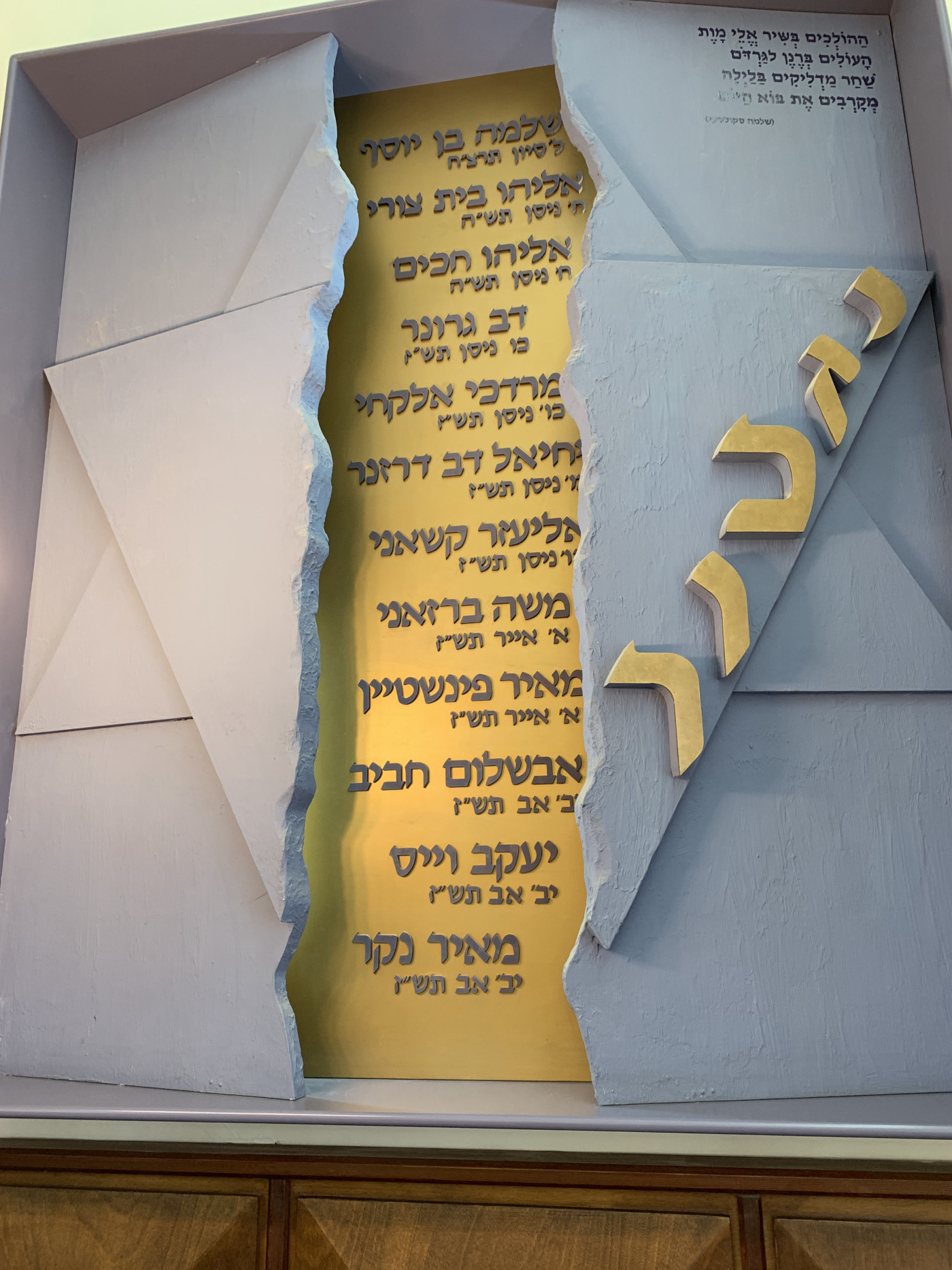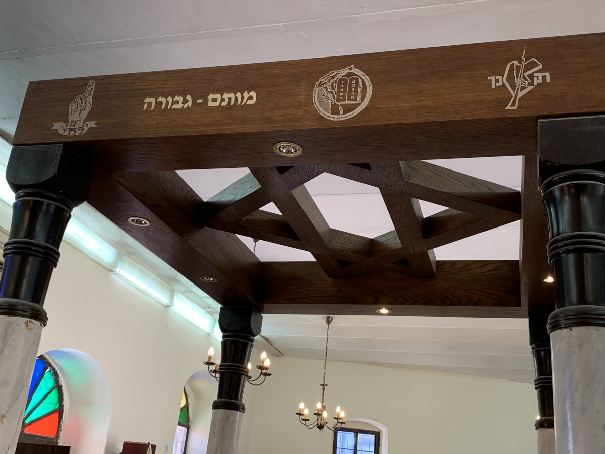 In 1955 the synagogue was officially dedicated to the memory of the twelve Olei Hagardom, and this beautiful commemorative plaque was erected on that occasion. Listed from top to bottom: Shlomo Ben-Yosef, Eliyahu Bet-Zuri, Eliyahu Hakim, Dov Gruner, Moredachai Alkahi, Yehiel Drezner, Eliezer Kashani, Moshe Barazani, Meir Feinstein, Avshalom Haviv, Yaakov Weiss, and Meir Nakar.