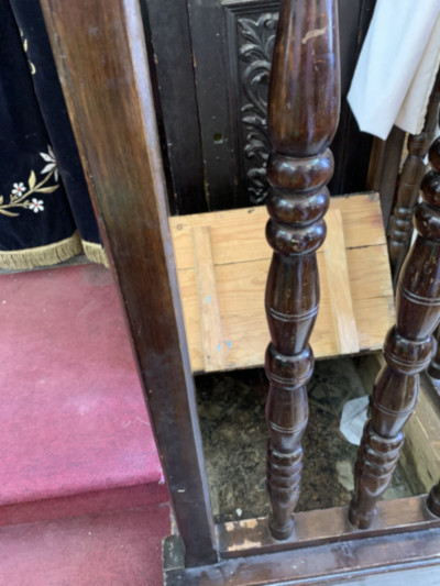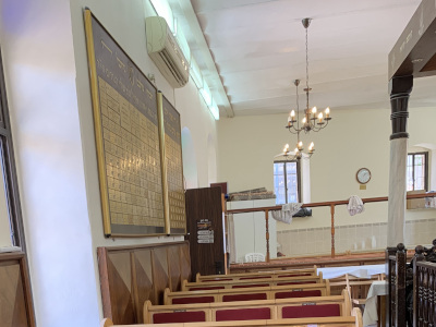 A view towards the "Habima" ("the stage" in Hebrew, where the Torah is read during the prayers), and the southern wall of the synagogue.