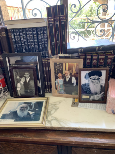 A view towards the Aron Hakodesh and the eastern wall of the synagogue. Avichai, Eliezer and I are examining the picture of Rabbi Aryeh Levin. The Yizkor plaque for "Olei Hagardom" is placed to the right of the Aron Hakodesh.