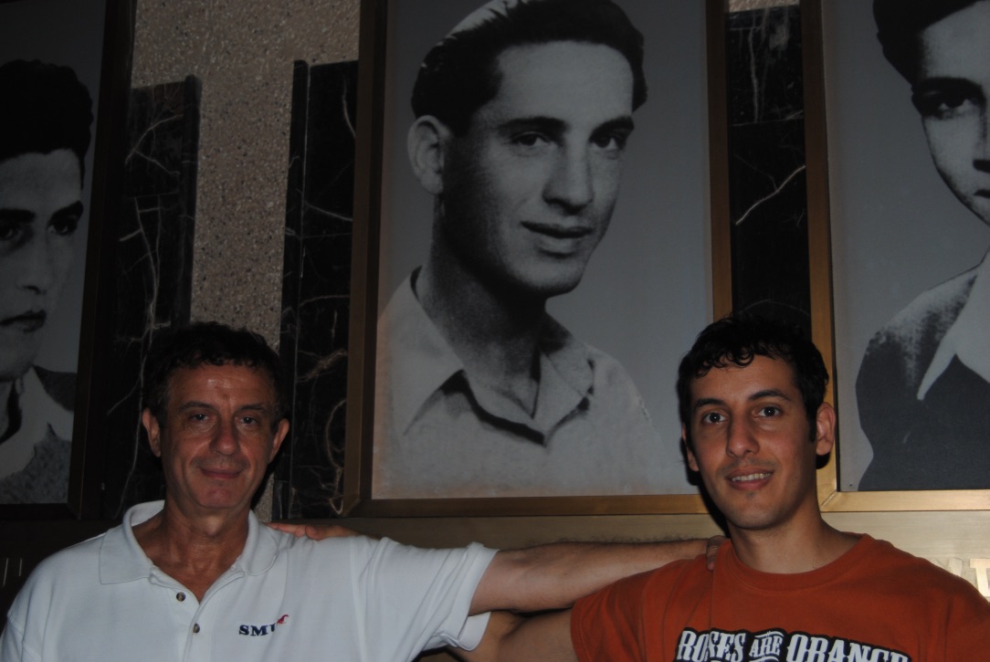 My son, Oren Feinstein (right), and I standing in front of the commemorative image of our uncle. The picture was taken by Emily, now Oren's wife, in October 2009. Perhaps there are some similarities in our faces?