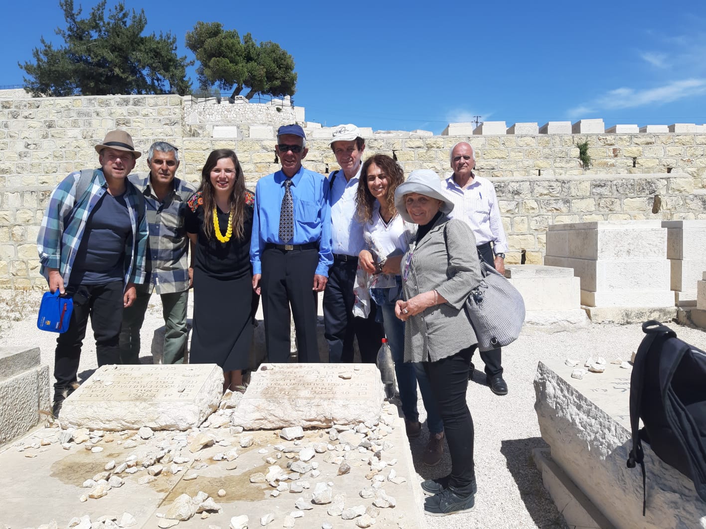 At the graves of Meir and Moshe: Oded Meir Amitai, the son of Rachel Kramer-Rechtman is on the left of Moshe's grave, and Chemda Elias-Rechtman, Rachel's daughter, is standing on the right of Meir's grave. I am standing to the right of my brother Eliezer, and our guide, Hodaya Alter, is standing to the left of Eliezer. Picture courtesy of Hodaya Alter.