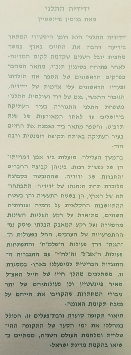 Yedidya Hatalgi is a historical novel that describes in detail the life in Eretz Israel
